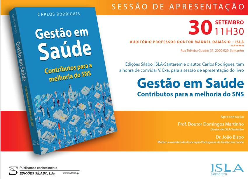 No dia 30 de setembro de 2023, às 11h30, no Auditório Prof. Doutor Manuel Damásio, as Edições Sílabo, o ISLA Santarém e o autor, Professor Doutor Carlos Rodrigues, convidam-no para a apresentação do livro "Gestão em Saúde: Contributos para a Melhoria do SNS". Esta obra, escrita por uma referência na área da Saúde, promete trazer valiosas contribuições para o aprimoramento do Serviço Nacional de Saúde (SNS).