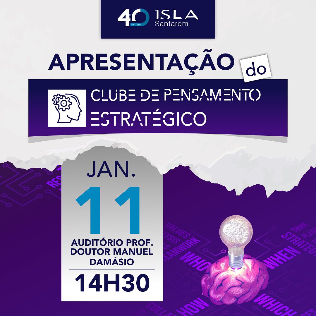 No âmbito das comemorações dos 40 anos do ISLA, temos o prazer de apresentar um projeto que promete enriquecer o nosso ambiente académico! O Clube de Pensamento Estratégico decorrerá no dia 11 de janeiro de 2024, às 14h30, no Auditório Prof. Doutor Manuel Damásio. Contaremos com pensadores que oferecem uma visão estratégica para o futuro do ensino e das comunidades! Juntos, vamos trabalhar para alcançar ainda mais excelência no ensino superior e na vida.