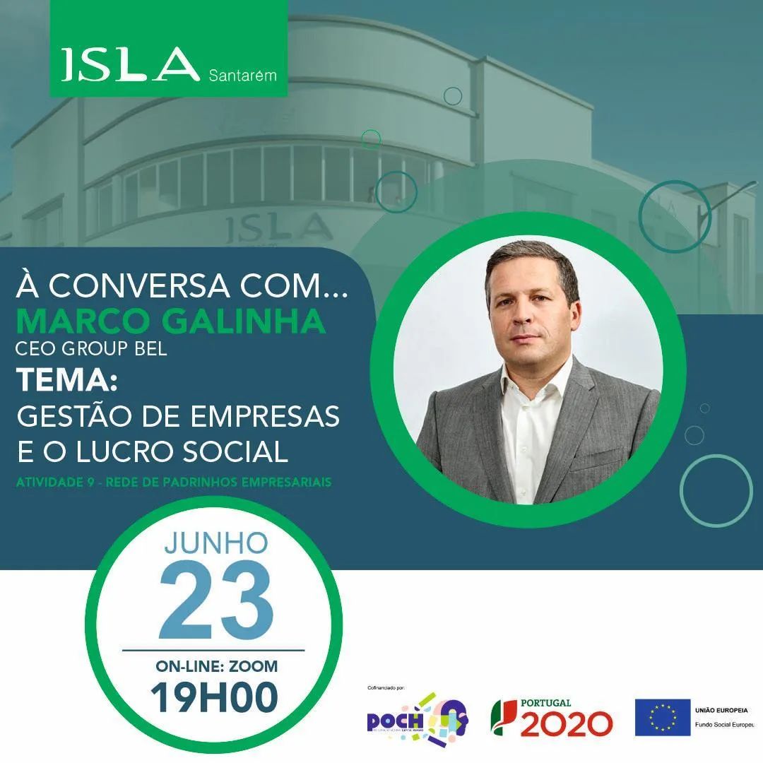 No dia 23 de junho de 2023, às 19h, irá decorrer o evento "À Conversa com Marco Galinha", CEO do Grupo BEL, que nos falará sobre "Gestão de Empresas e o Lucro Social". Este evento está inserido na Atividade 9 - Rede de Padrinhos Empresariais, no âmbito do Projeto SKILLS 4 PÓS-COVID – COMPETÊNCIAS PARA O FUTURO NO ENSINO SUPERIOR, POCH-02-5312-FSE-000001.