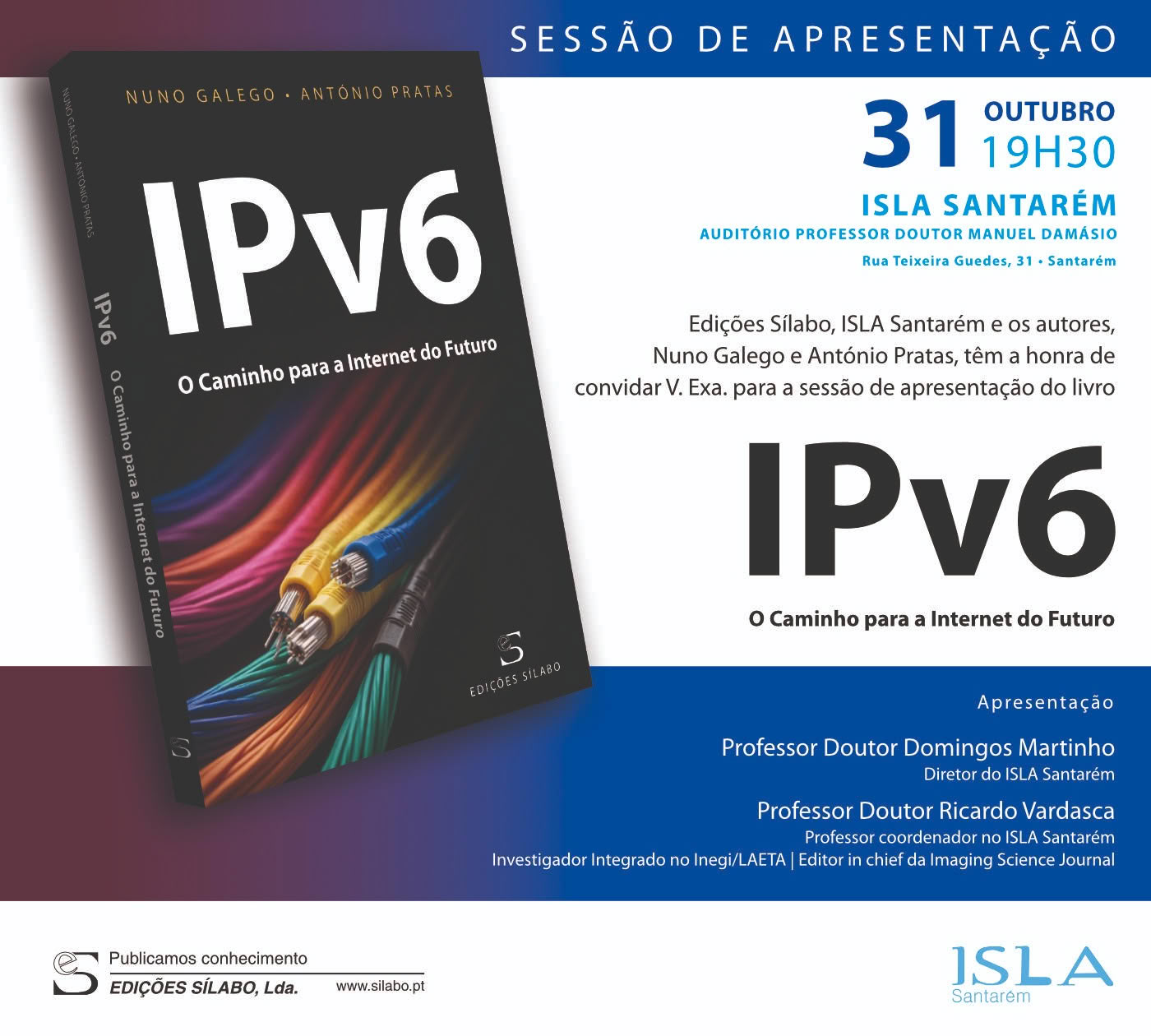 No próximo dia 31 de outubro de 2024, pelas 19h30, terá lugar a apresentação do livro "IPv6: O Caminho para a Internet do Futuro" no Auditório Professor Doutor Manuel Damásio, no ISLA Santarém.