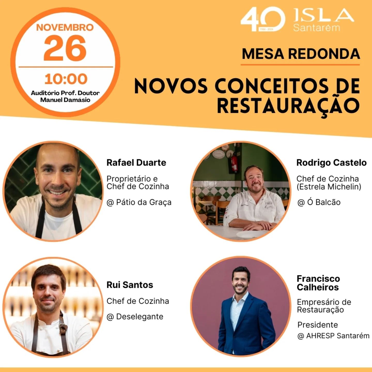 O evento Mesa-redonda: Novos Conceitos de Restauração ocorre no dia 26 de novembro de 2024, às 10h, no Auditório Prof. Doutor Manuel Damásio, no ISLA Santarém. Organizado no âmbito dos cursos TESP e da Licenciatura em Gestão Turística, com o objetivo de abordar as tendências e inovações no setor da restauração.