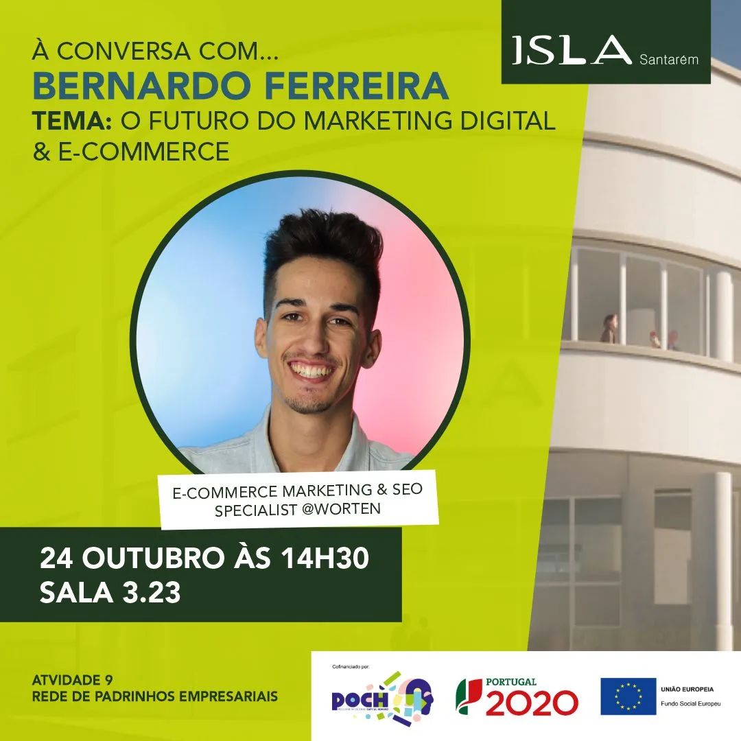 O ISLA Santarém convida para uma conversa imperdível com Bernardo Ferreira sobre "O Futuro do Marketing Digital & E-Commerce". Este evento será realizado no dia 24 de outubro de 2023 às 14h30 na sala 3.23. Bernardo Ferreira, especialista em Marketing e SEO para E-Commerce na Worten, partilhará a sua experiência e conhecimentos sobre as tendências emergentes no marketing digital e o desenvolvimento do comércio eletrónico.