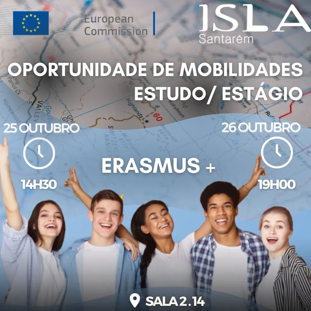 Nos dias 25 de outubro de 2023, às 14h30, e 26 de outubro de 2023, às 19h00, na sala 2.14, decorrerão sessões de esclarecimento sobre oportunidades de mobilidade para estudo e estágio para os nossos estudantes.